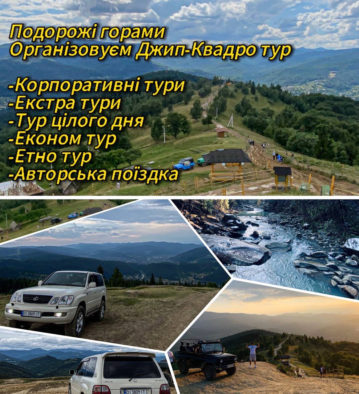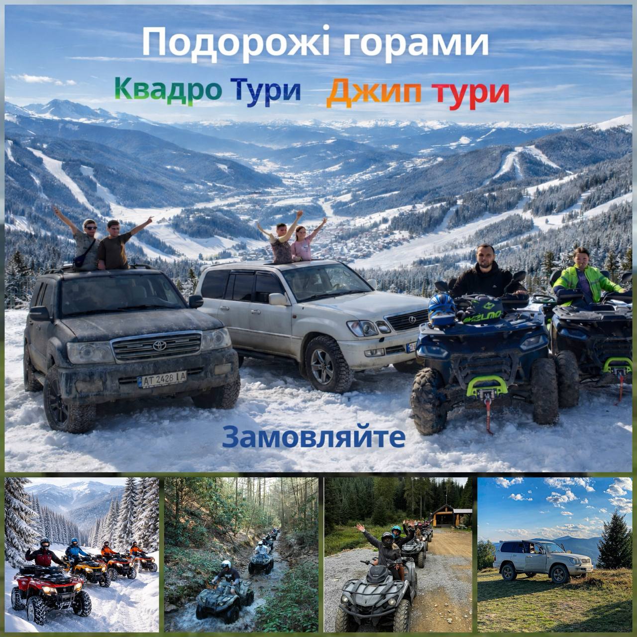 Ми організуємо джип-тури та квадро-екскурсії для компаній, сімей та пар. Є різні маршрути — від легких прогулянок до екстремальних підйомів.
